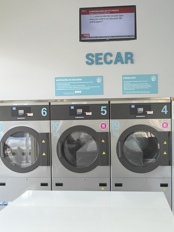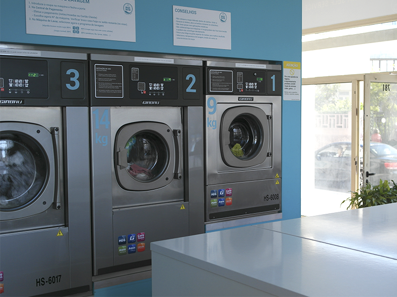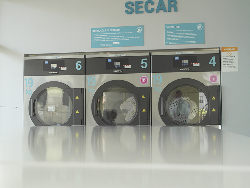 A roupa lavada nas nossas máquinas sai mais enxuta (devido a altas velocidades de centrifugação); desta forma a secagem é mais eficaz, quando comparada com a roupa que vem de casa.